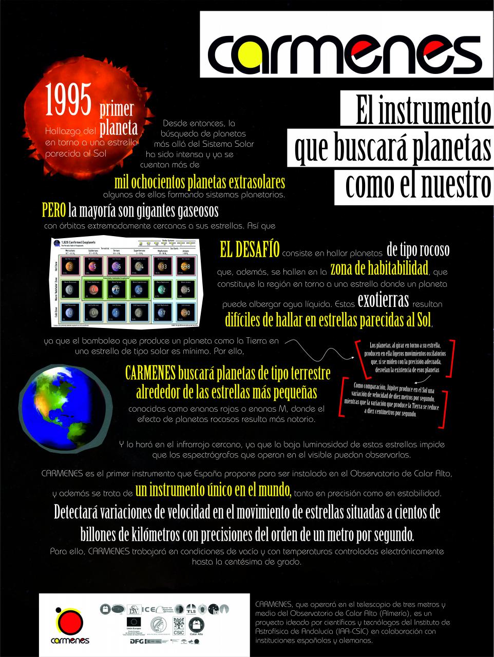 CARMENES is not only the first instrument that Spain proposes to be installed at Calar Alto Observatory, but further it is a unique instrument in the world, in both precision and stability, indispensable qualities for measuring the small speed variations a planet produces in the stars. In fact, CARMENES represents an exciting technological challenge, as it will detect speed variations on stars which are hundred of billions kilometers away, with an accuracy of one meter per second.