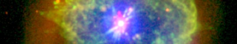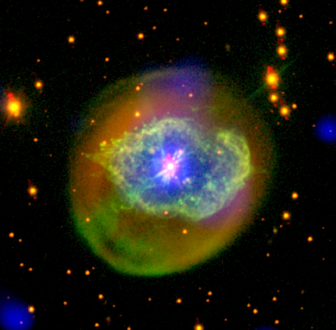 This three-colour image combines X-ray data collected in 2013 by XMM-Newton (blue) with optical observations obtained using two special filters that reveal the glow of oxygen (green) and helium (red). The optical data were gathered in 2014 with the Andalusian Faint Object Spectrograph and Camera at the Nordic Optical Telescope on La Palma, in the Canary Islands. A study of the X-ray emission from Abell 78 is presented in a paper by J.A. Toalá et al. 2015.
