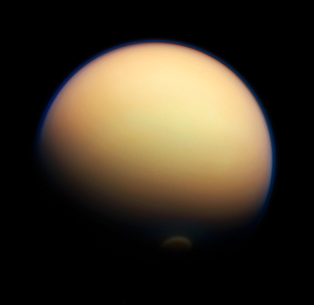La densidad de la atmósfera de Titán supera la de la Tierra, y genera una presión sobre la superficie algo mayor que en nuestro planeta, similar a la del fondo de una piscina. Al igual que en la atmósfera terrestre, en la de Titán predomina el nitrógeno (98,4%), pero el resto de los componentes, como el metano (1,4%) y otros compuestos orgánicos, establecen grandes diferencias. Titán muestra, además, lo que se conoce como “súper rotación”: rota muy lentamente –tarda dieciséis días terrestres para completar un giro sobre sí mismo–, pero sus vientos se mueven a mayor velocidad que la propia superficie (algo que también ocurre en Venus, pero a mayor escala).