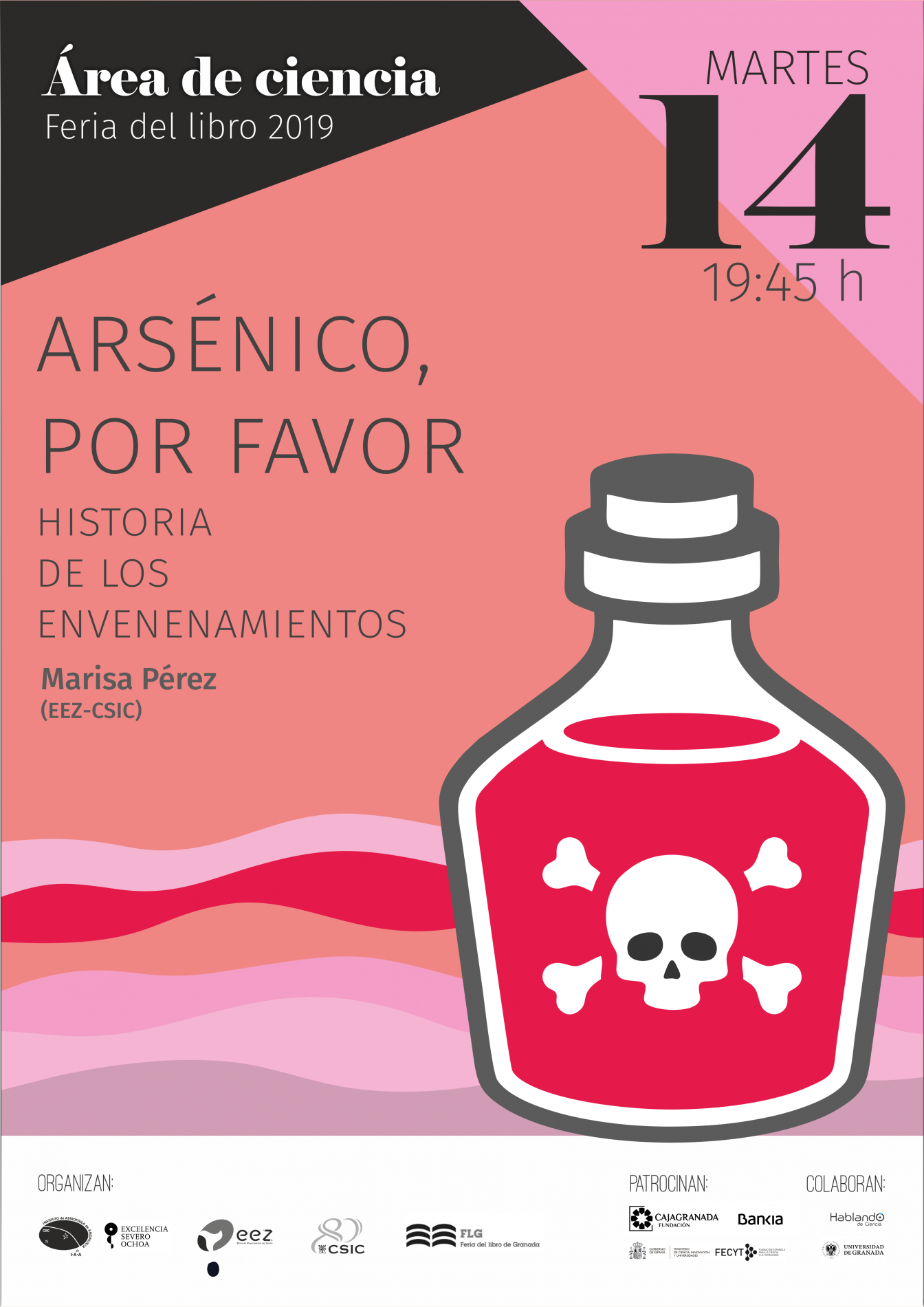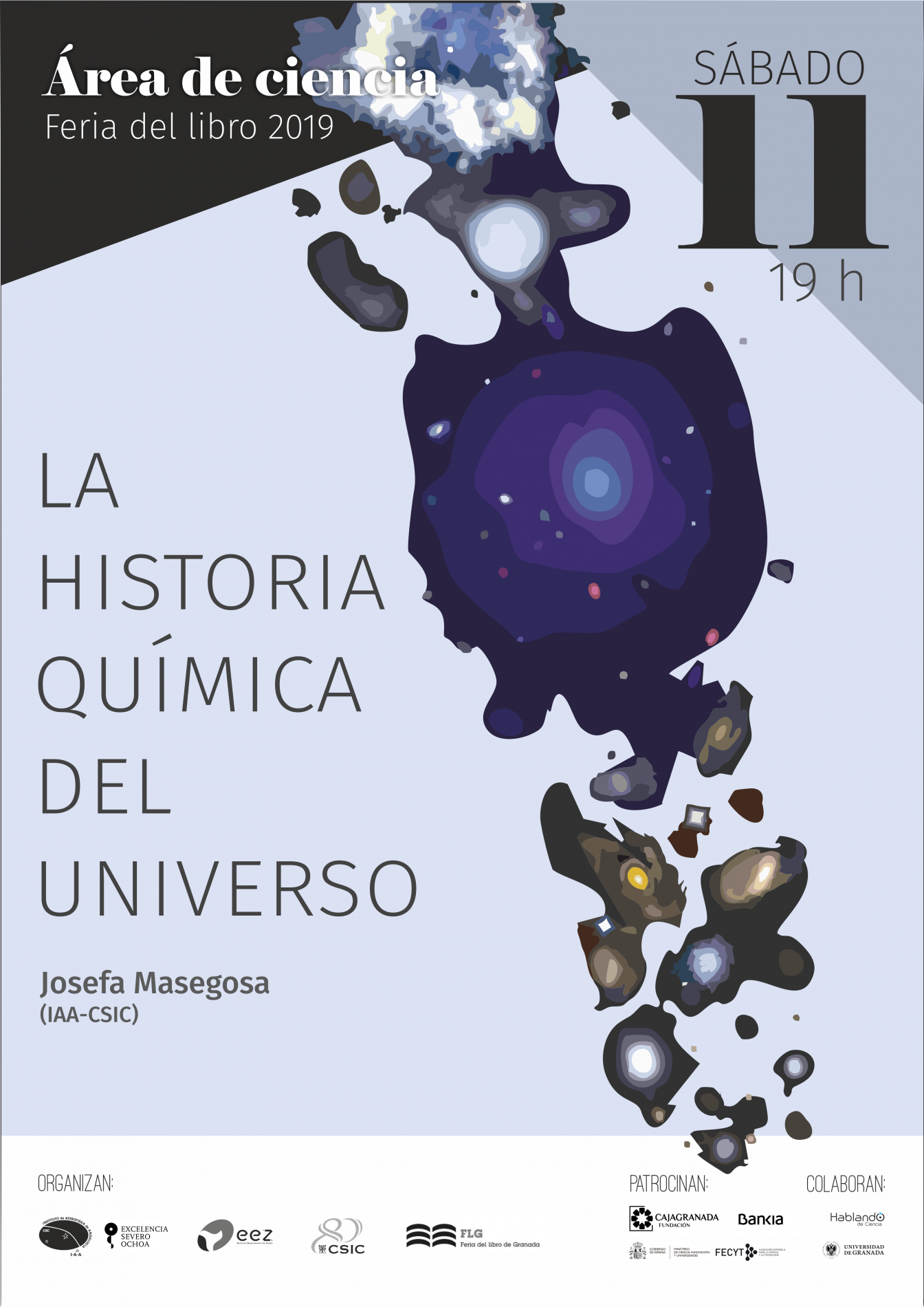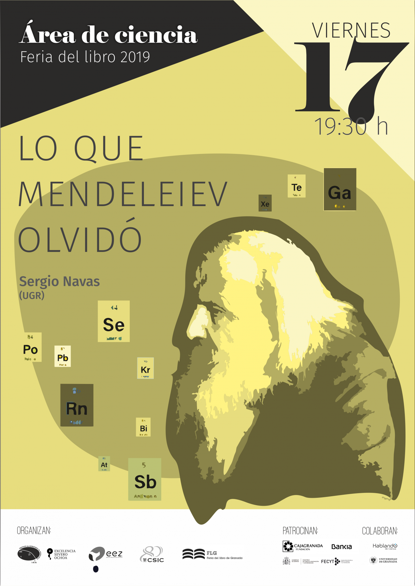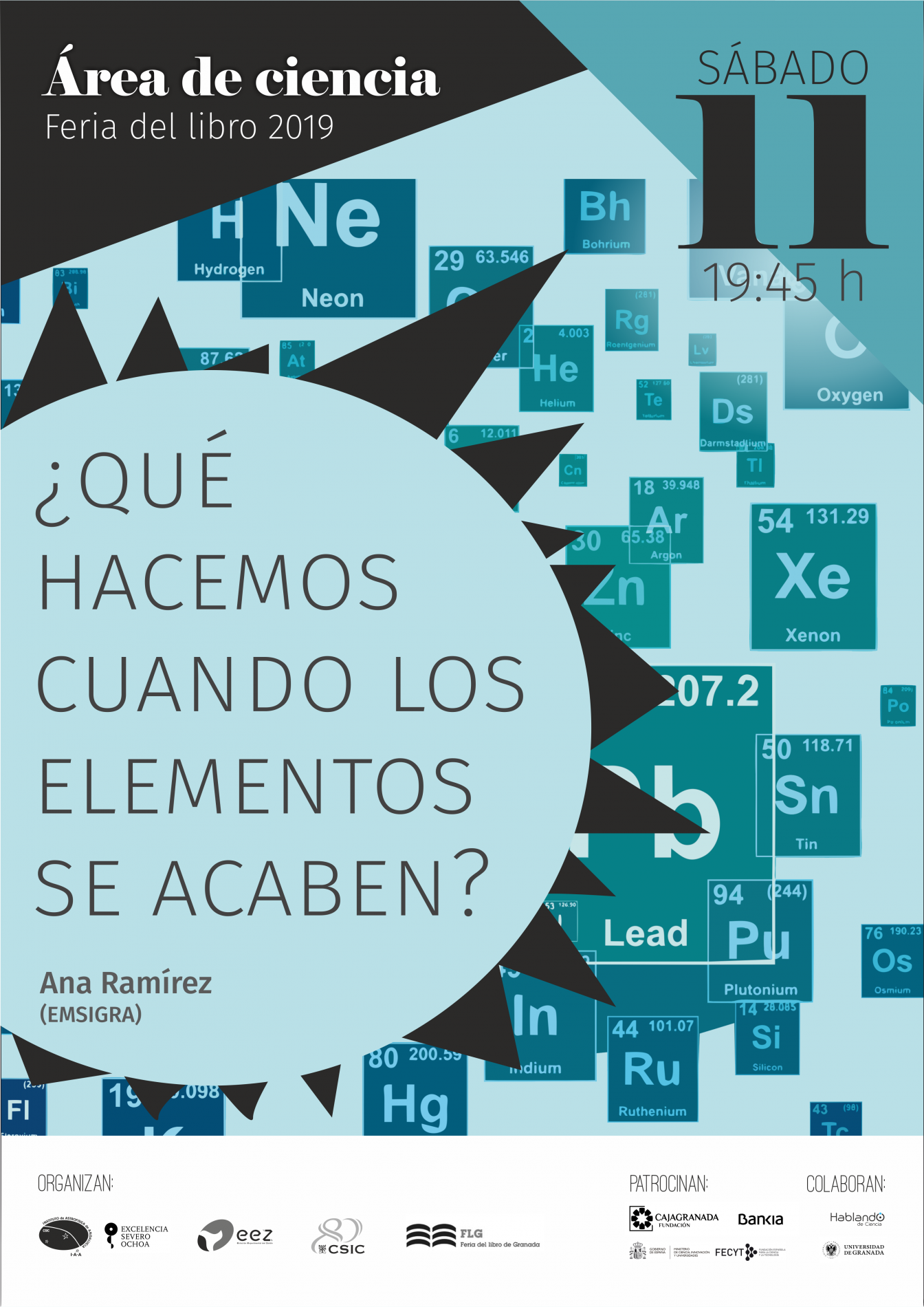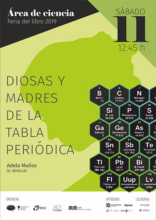 Organizada por el Instituto de Astrofísica de Andalucía (IAA-CSIC), la Estación Experimental del Zaidín (EEZ-CSIC), la Vicepresidencia Adjunta de Cultura Científica CSIC y la propia Feria del Libro de Granada, con el patrocinio de CajaGranada Fundación - Bankia y Fundación Española de Ciencia y Tecnología (FECYT) - Ministerio de Ciencia, Innovación y Universidades, y la colaboración de la Asociación “Hablando de Ciencia” y la Universidad de Granada (UGR), este año la programación científica de la feria del libro se articulará en torno a la Tabla Periódica, con motivo de su 150 aniversario.
